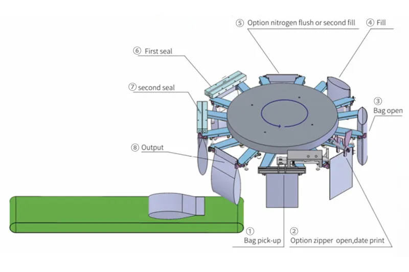 صممت ماكينة التعبئة الدوارة الآلية YL-8SR لتعبئة الأكياس الجاهزة بكفاءة عالية، سواء كانت مسطحة أو مصنوعة من البولي إيثيلين. تتكامل هذه الآلة متعددة الاستخدامات بسلاسة مع أنظمة الوزن والجرعات المختلفة لتلبية متطلبات التعبئة والتغليف أحادية ومتعددة المواد.